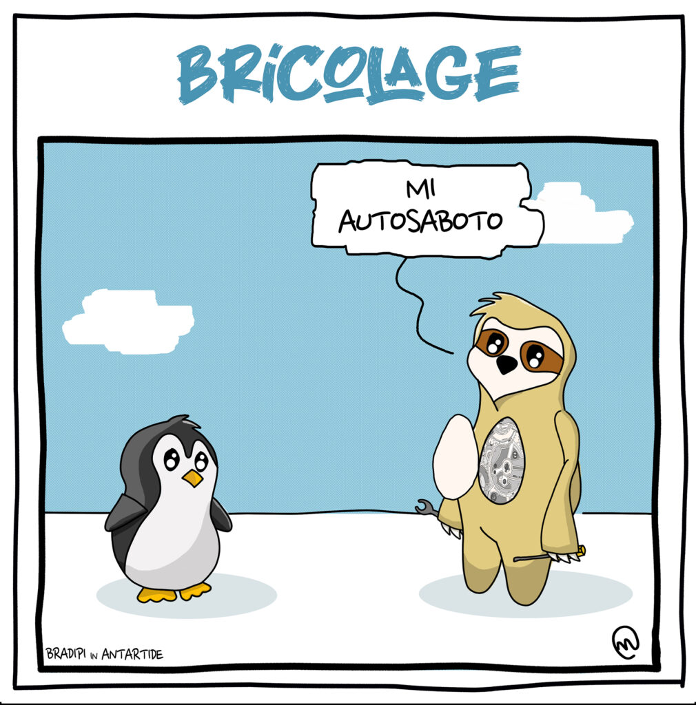 [Descrizione immagine: una delle prime vignette del bradipo. Si chiama “In analisi”. Il Bradipo è disteso su un lettino dall’analista/pinguino che chiede “mi parli di sua madre”. Il Bradipo risponde Mi diceva sempre: sei lento!”]